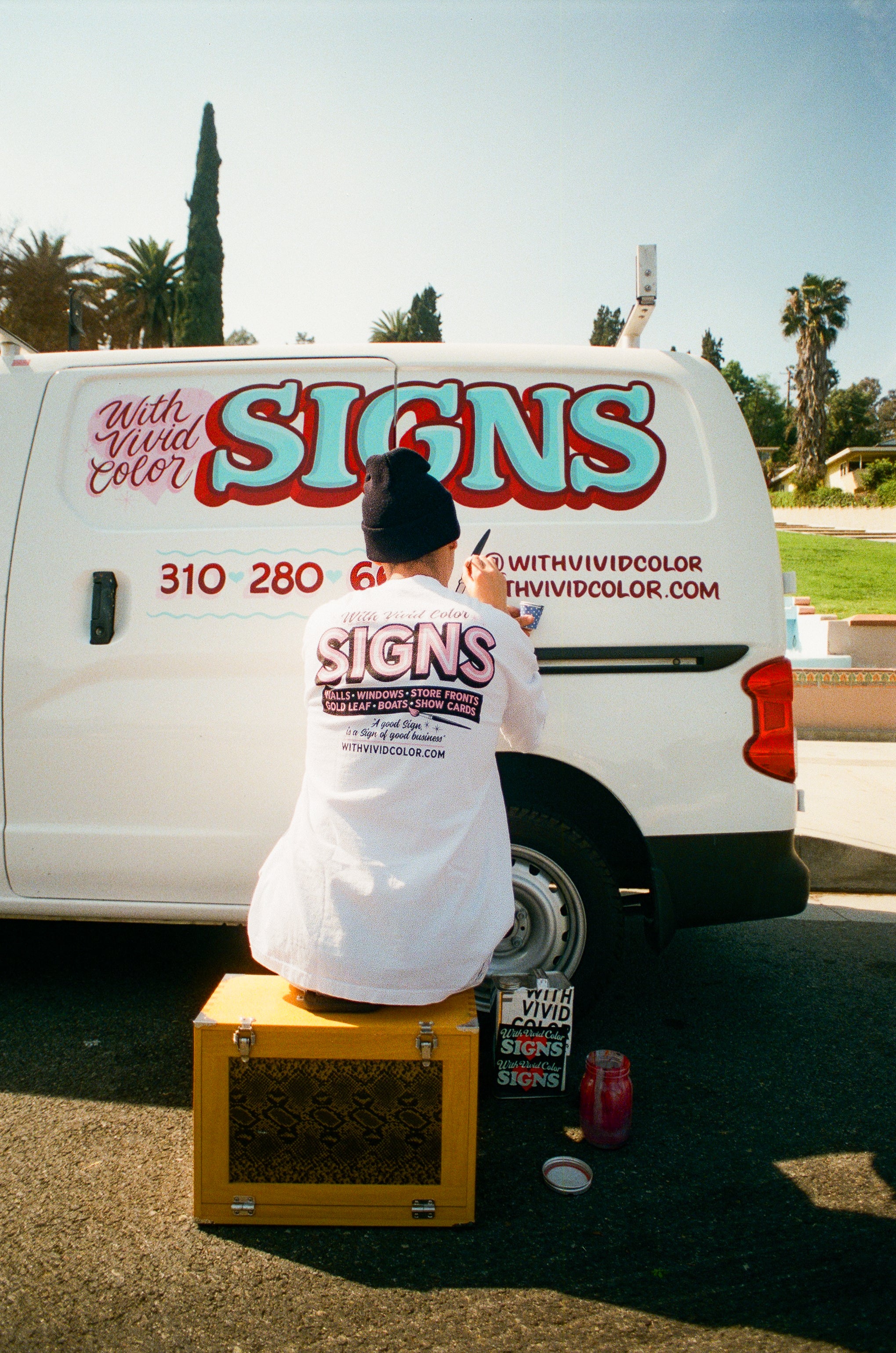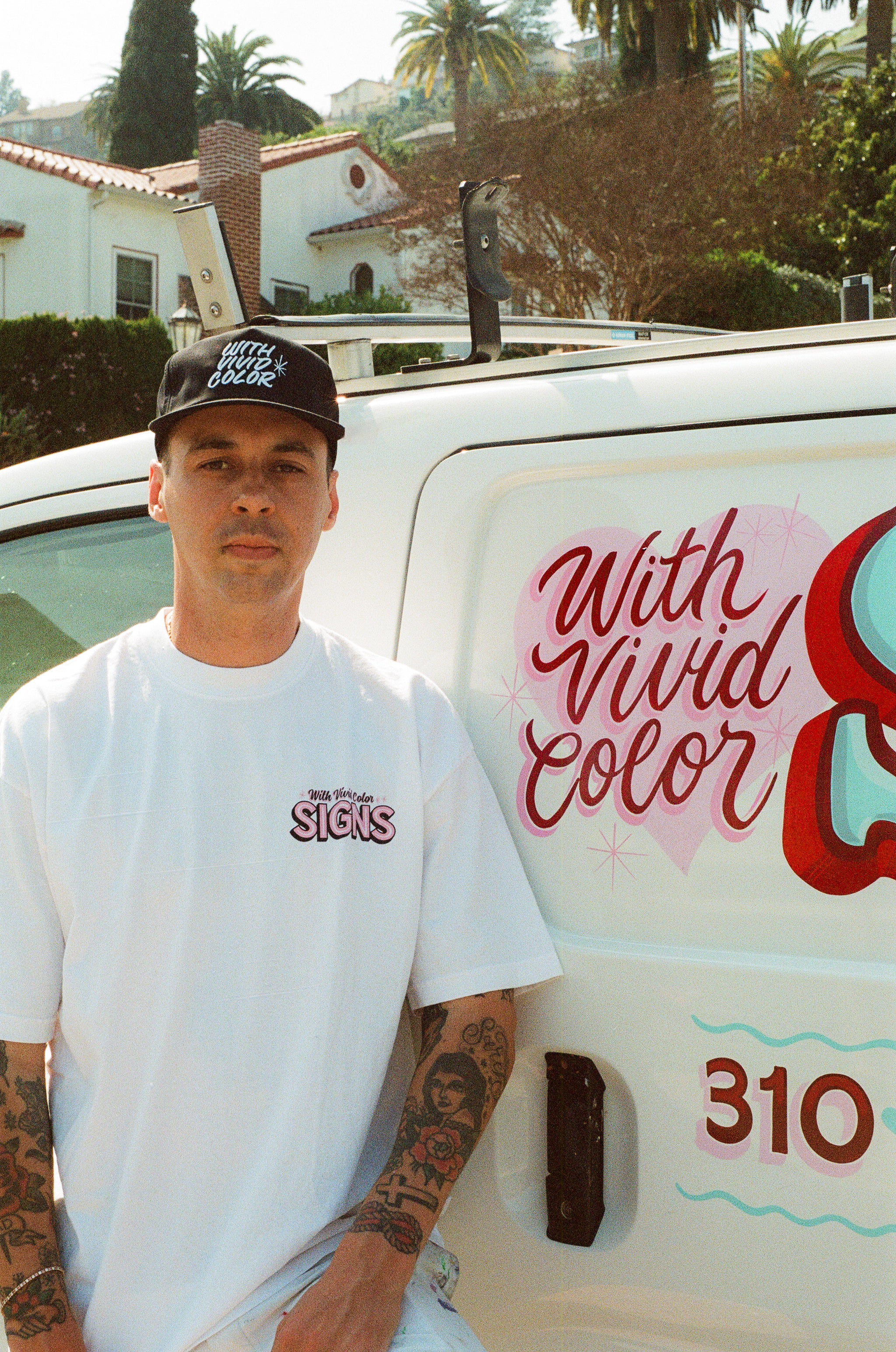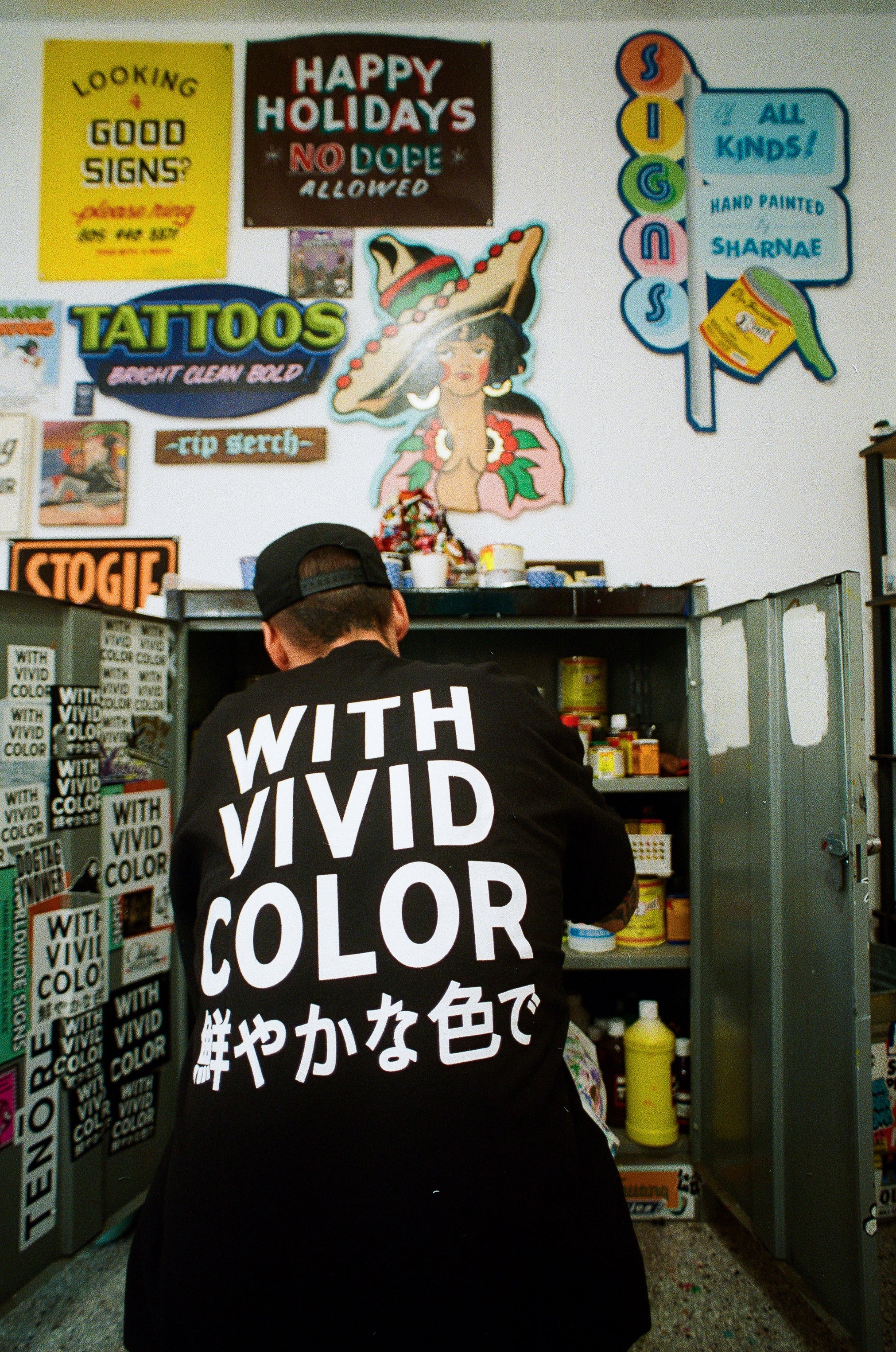 Based in Los Angeles California, With Vivid Color is a multi racial family business started by Julien Bleser and Sharnae Caceres. Specializing in hand painted signs, graphics and murals. Their work can be seen all over Los Angeles, as well as other major cities, such as Las Vegas, Phoenix, San Francisco, and many more. Their ability to adapt to any type of medium is what sets them apart from other sign companies/artists. They take pride in their ability to meet their clients' needs and make their vision come true. High gloss or flat, long-lasting, or temporary, these vibrant signs are sure to draw people in. Some of their clients include Vans, Supreme, Undefeated, Golf, FTP, Sari Sari Store, Bella Dona, Born x Raised, Wacko Maria and many more.